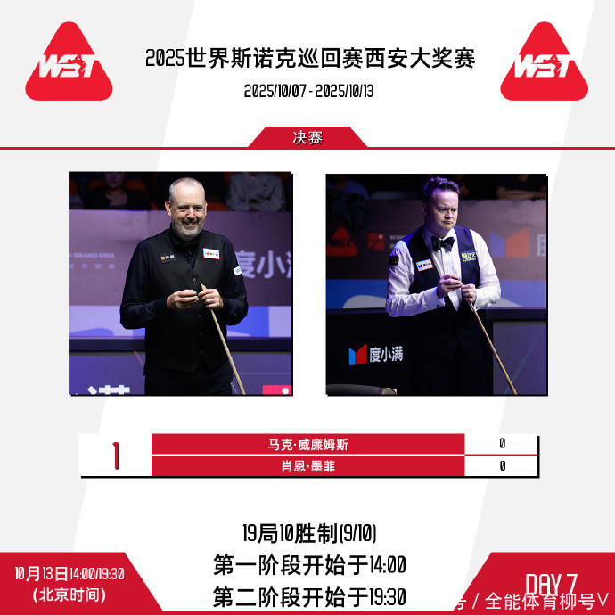 北京时间10月13日消息,2025年斯诺克西安大奖赛上演终极决战,CCTV5+、CCTV5分14:00、19:30两个时段,直播决赛实况。即将开赛的决赛,“魔术师”肖恩-墨菲将背靠背向半个月内的第二冠军发起冲击,他的对手是3届世锦赛冠军马克-威廉姆斯。